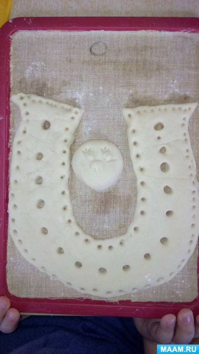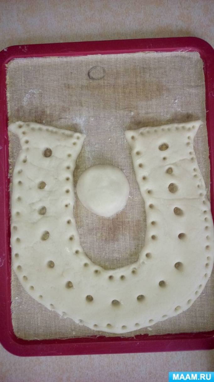 На раскатанное тесто накладываем наше лекало Подкова» и вырезаем по контуру при помощи стеки
