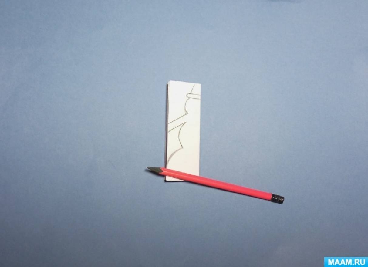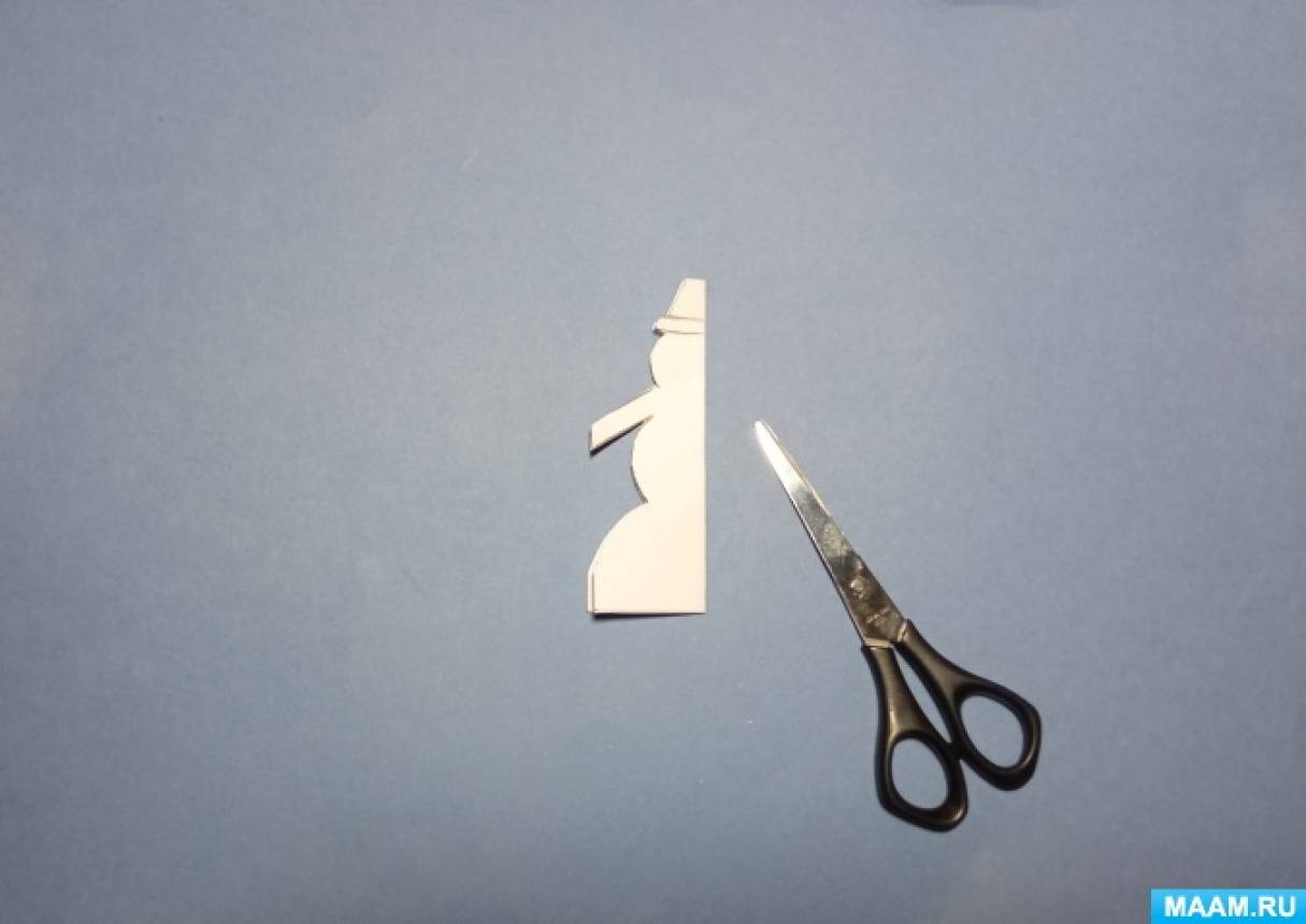 На сложенной гармошкой заготовке рисуем снеговика в профиль.