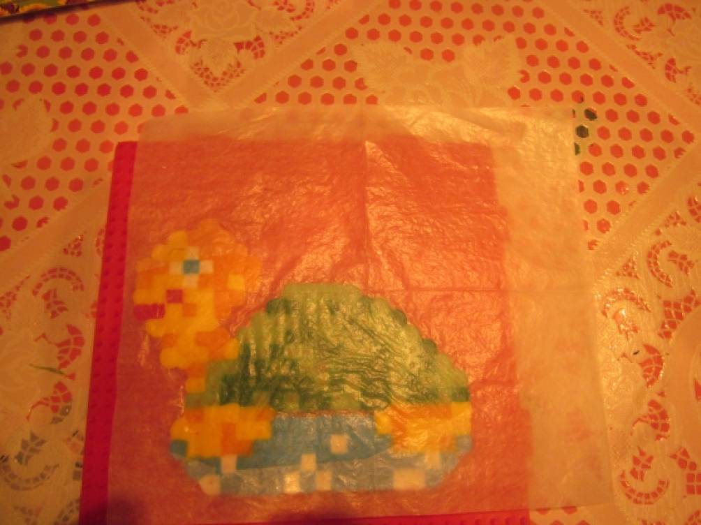 Процесс работы действительно прост. В набор входят бусинки и поле с «гвоздиками», нужно насадить первые на вторые по заданной схеме, которая тоже бывает в наборе. Когда рисунок будет готов, следует прогладить его через бумагу, кальку или специальную пленку утюгом. Бусинки склеятся и получится целое панно.
