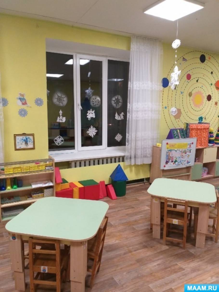 В группе на потолках объемные снежинки и снега. Окна украшены с помощью снежинок их из искусственного снега и вытыканок.