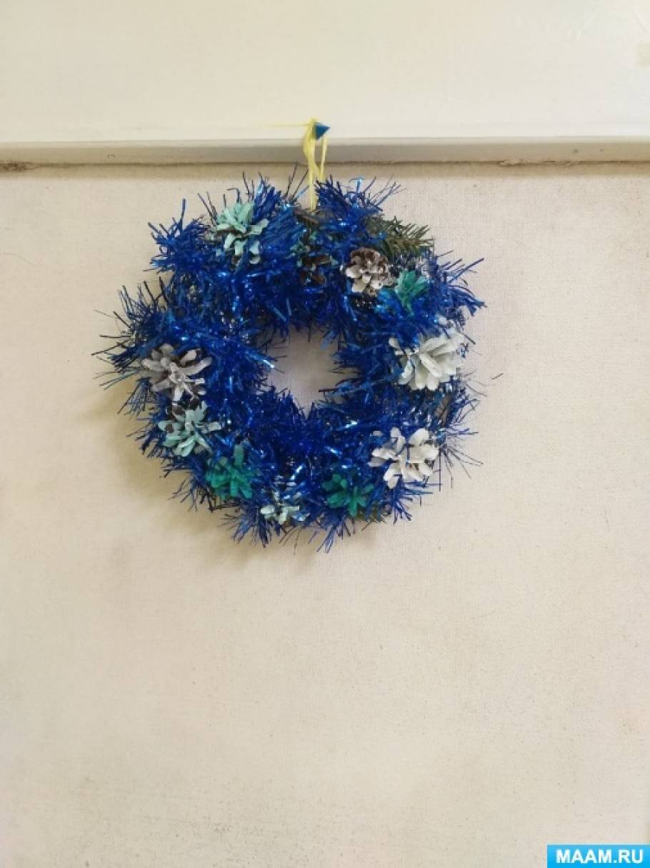 Дверь группы украшена венком, сделанный из шишек, раскрашенных детьми.