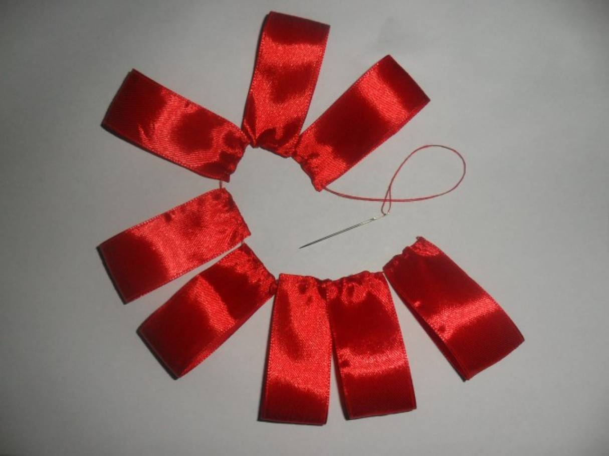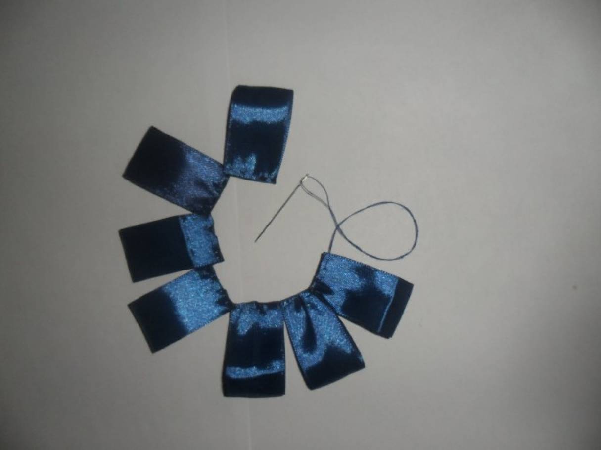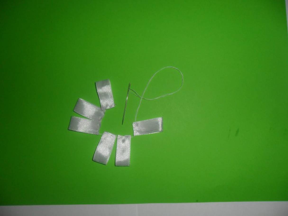 Опаленную по краям ленту из органзы также стягиваем с помощью нитки и иглы.