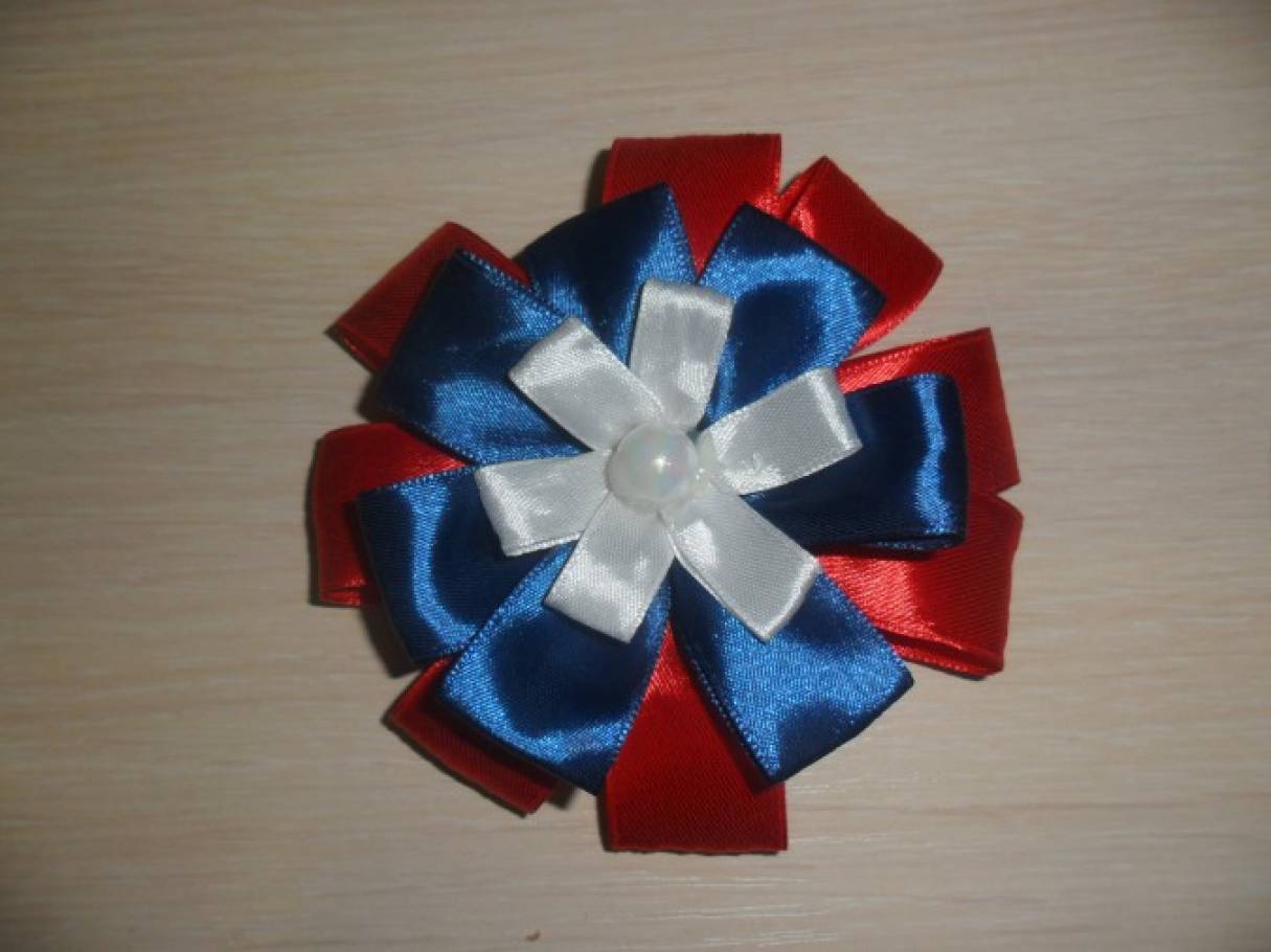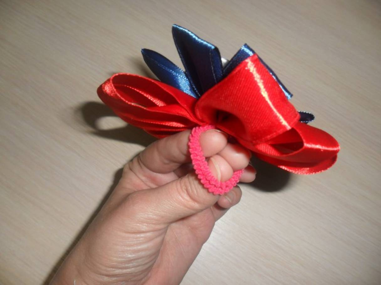 Нам понадобятся: синие, красные, белые атласные ленты, бусинка, резиночка для волос.