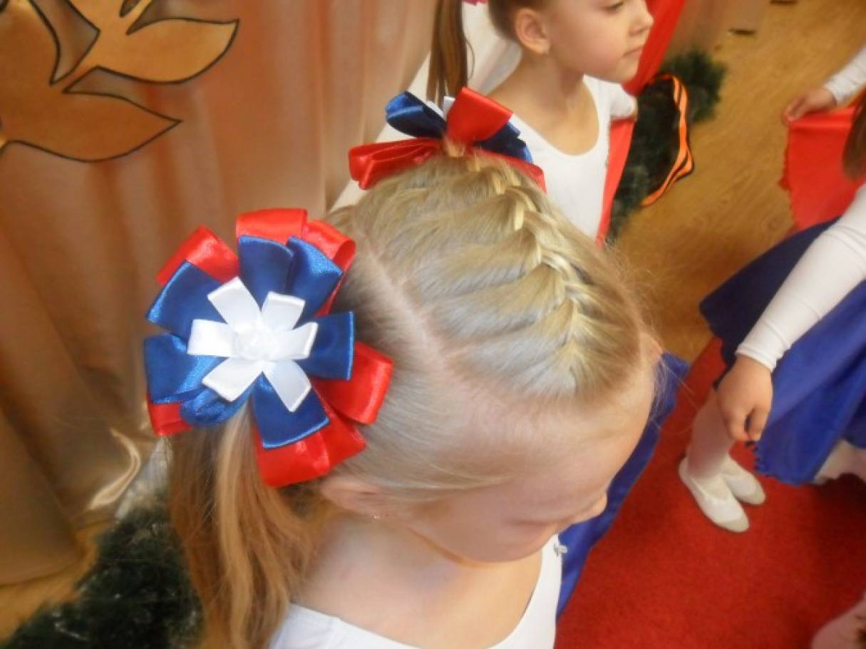 Эти бантики мы использовали как дополнение к костюму на танец. Можно использовать на праздник День защитника отечества, день освобождения города, День победы, вообщем любой патриотический праздник, или спортивный праздник, где есть шевствия с флагами.