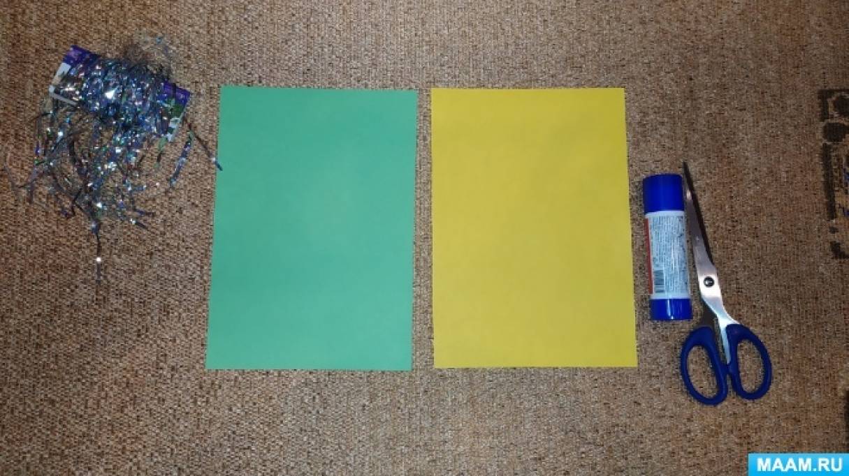 Цветную бумагу форматом А4 разрезаем пополам и берём для работы две половинки разного цвета.