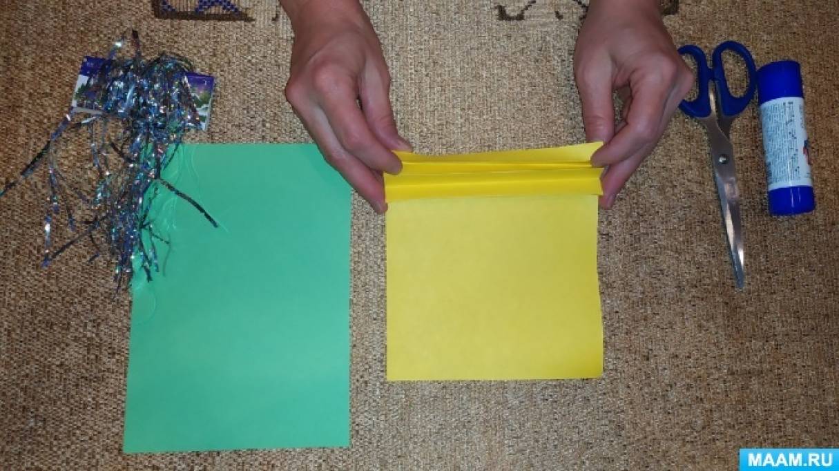 Бумагу сгибаем «гормошкой» по длине прямоугольника. Сгибы хорошо проглаживаем пальцами.