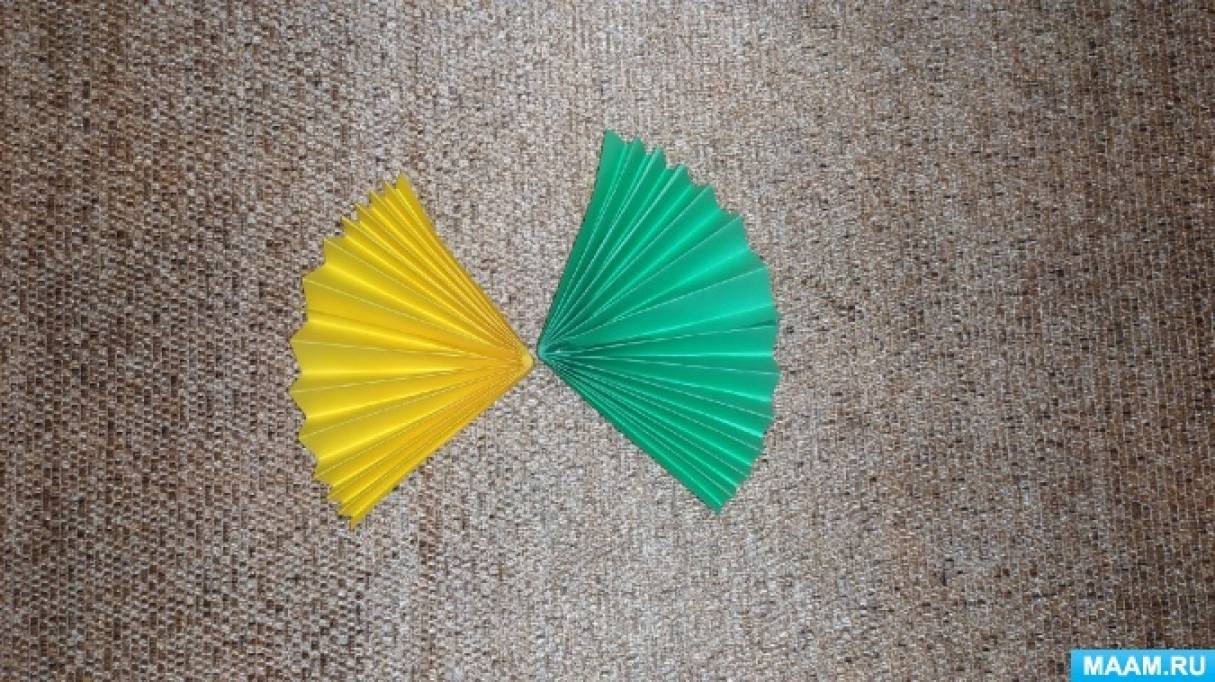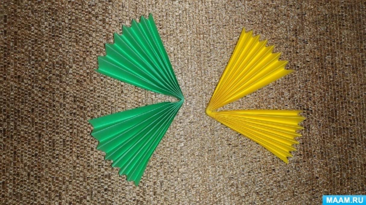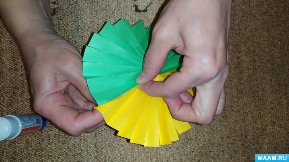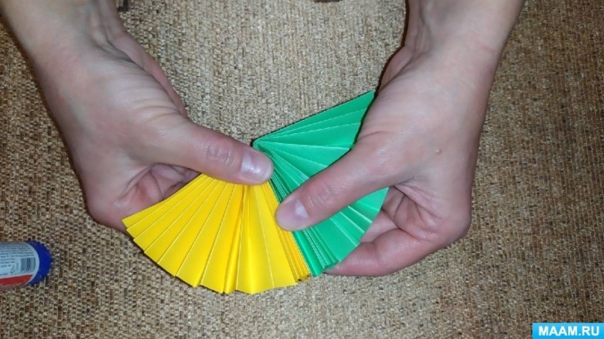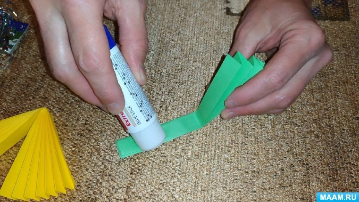 Далее «гормошку» сгибаем пополам и склеиваем две детали вместе. Стараемся ровно совмешать все стороны.