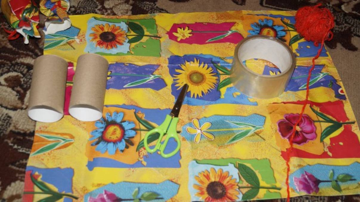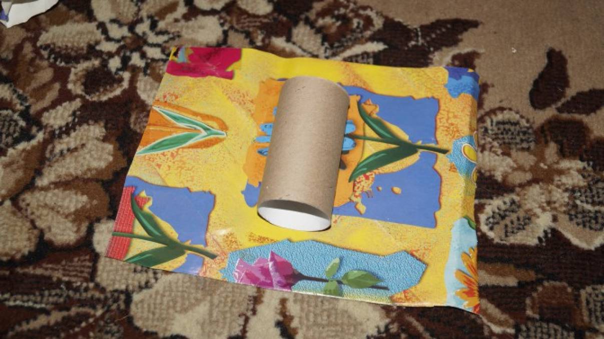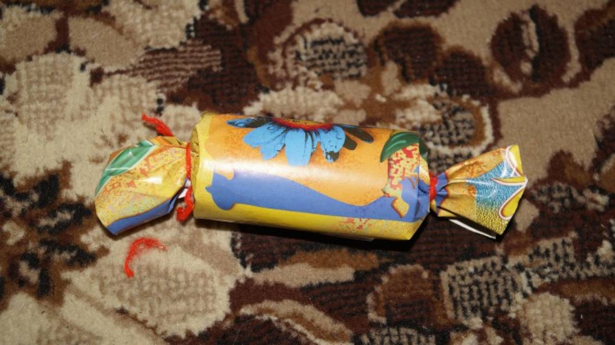 Берем красивую, яркую (можно цветную бумагу), а можно цветную мягкую фольгу. Отрезам от этой бумаги прямоугольную фигуру, чтобы если положить в середину нашу втулку, по краям (длина) осталось по 10-15 см. Заворачиваем втулку, а кроя свободные скручиваем как у настоящей конфеты.