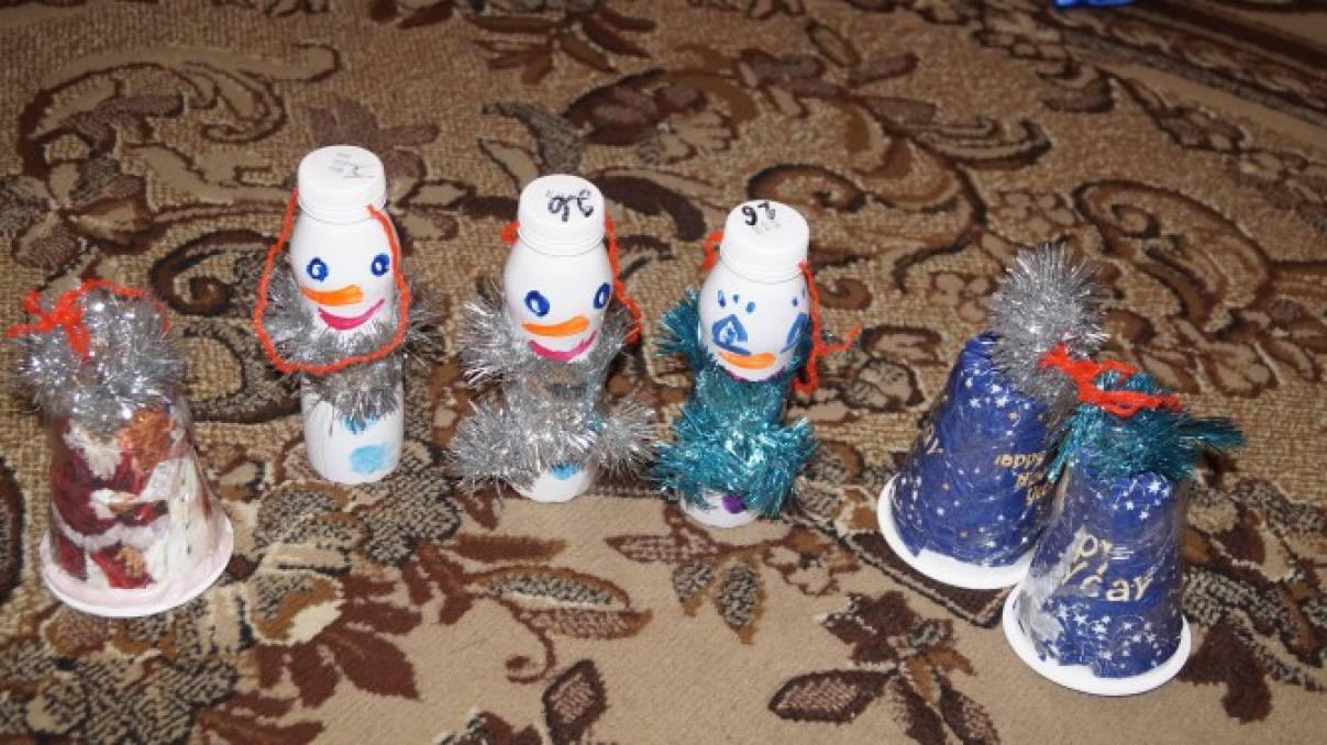 Также пригодились бутылочки из под йогурта,из них получились замечательные снеговики, а из баночек -колокольчики. Желаю всем творческих успехов и удачи в будущем году!