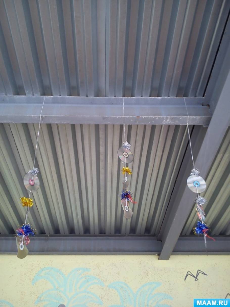 Новогоднее украшение для веранды на прогулочном участке «Елочные игрушки» из компакт-дисков
