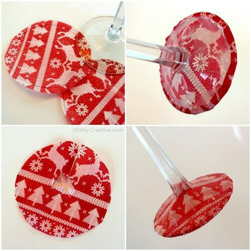 Что-то подобное можно сделать и с бокалами (разукрасить нижнюю поверхность ножки), но почему бы для разнообразия не использовать другие подручные материалы? Например, сделать чехлы из салфеток с новогодним орнаментом и яркой праздничной ленты.