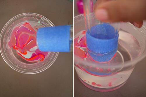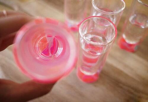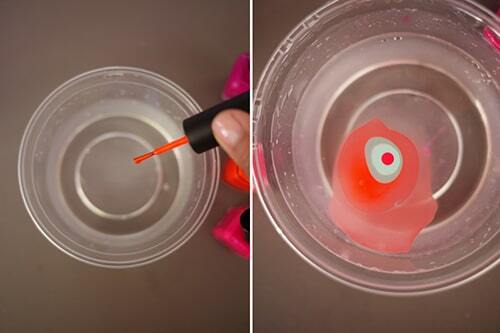 Обмотайте верхнюю часть стаканов малярным скотчем, чтобы не запачкать их в процесНаполните пластиковый стаканчик водой комнатной температуры, после чего откройте все пузырьки с лаком и начните осторожно капать в воду. Роняйте капли разных цветов слоями, одну поверх другой. Не дотрагивайтесь до поверхности воды на этом этапе работы!