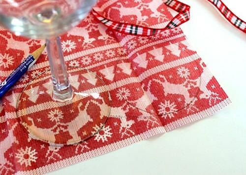 Вырезать из салфетки с новогодним рисунком круг по диметру ножки бокала. Таких кругов должно быть два. Один на низ ножки, другой наверх;