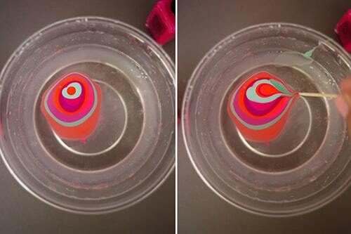 Начать капать в емкость с водой лак. Цвета наливаются один поверх другого;