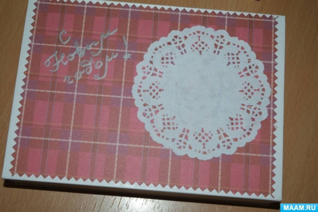 Наклеиваем салфетку. Её можно заменить кусочком ткани: кружевной, льняной, мешковины. Фломастером пишем поздравительную надпись.