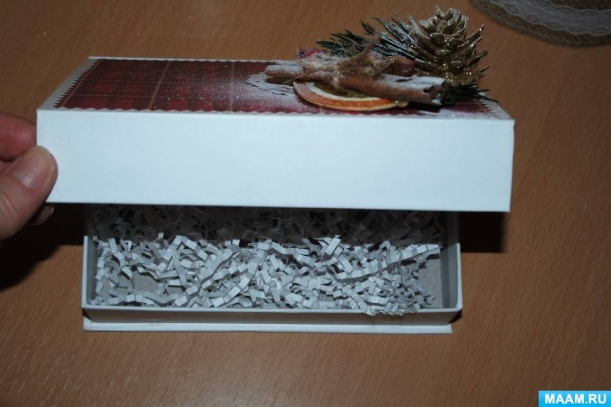 На Новый Год принято обмениваться подарками. Если при выборе коробки у вас возникли серьёзные трудности, изготовьте её своими руками. Надо лишь подобрать упаковку подходящей формы и размеры исходя из того, что вы решили преподнести в качестве подарка. Предлагаем познакомиться с особенностями создания подобных изделий, а также инструкциями по их изготовлению.