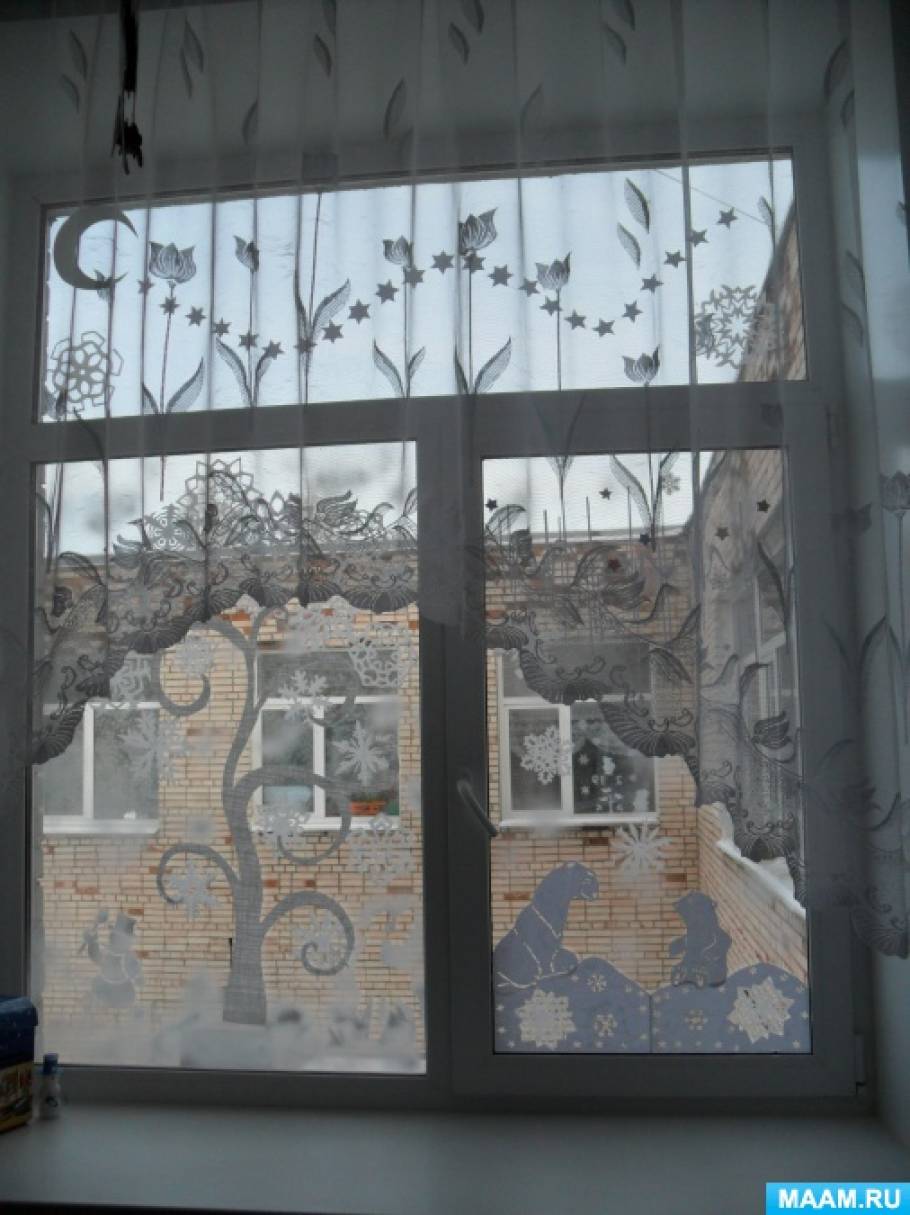 Окно украсили сказочным деревом из снежинок, вытынанками из бумаги — Медведица с Умкой на льдине, а также добавили в композицию немного искусственного снега. На самом верху окна месяц со звездами, вырезанные из белой бумаги.