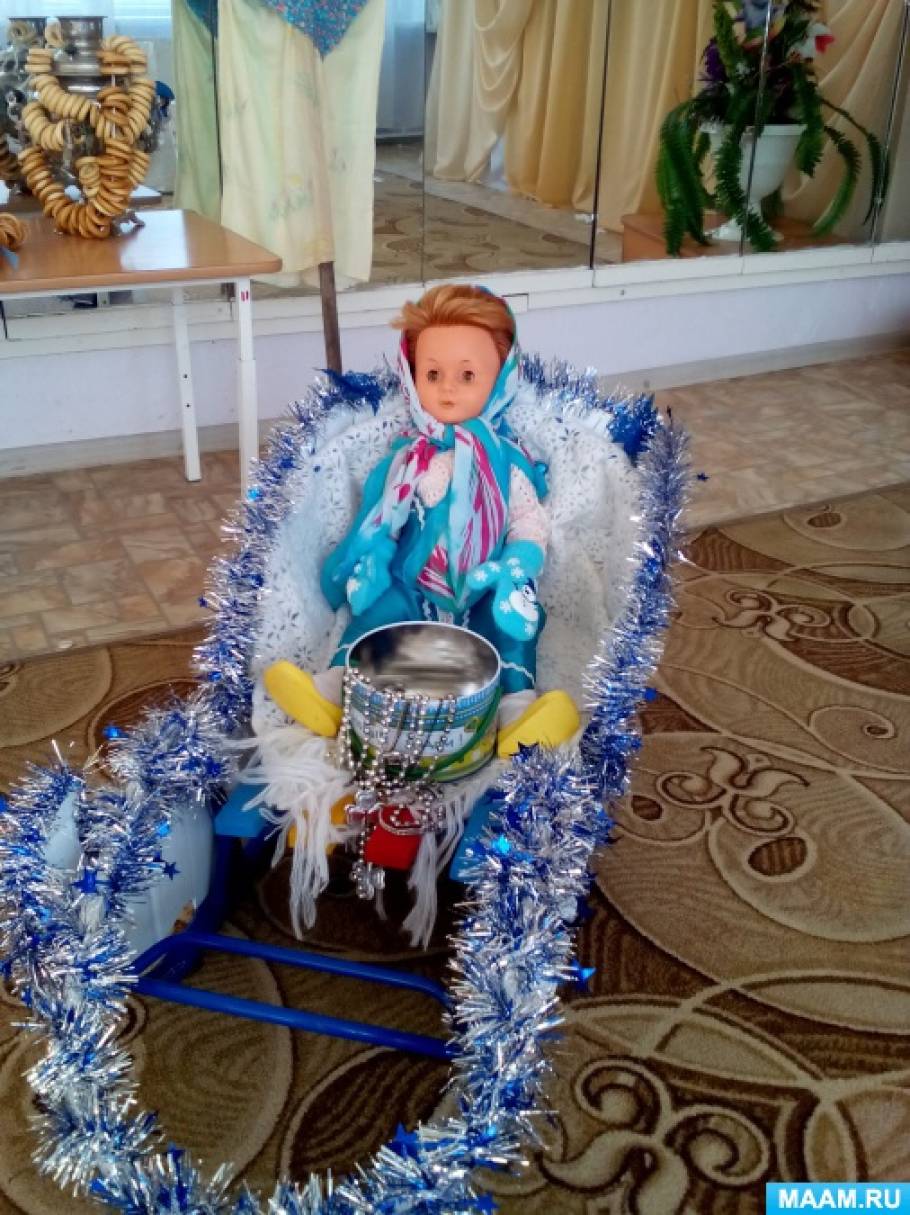 Сани вышли просто сказочно великолепны! Узоры по бокам, мишура, колокольчики хорошо передали образ сказки, на сани посадили куклу Настеньку, нарядили ее в русский платок. А рядом с Настенькой стоит шкатулка с приданным, которым наградил ее Морозко! Хороши получились сани!
