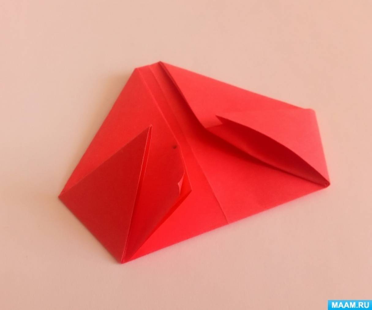 - острые углы (по 2 на каждой стороне) в верхней части загибают, поделку переворачивают лицевой частью кверху.