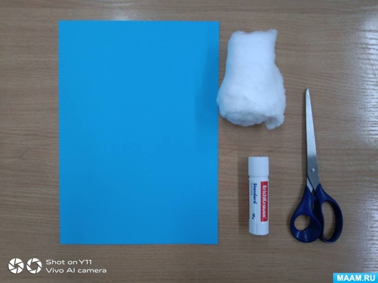 Для мастер – класса нам понадобится: цветная бумага голубого цвета, клей — карандаш, ножницы, кусочек ваты и отличное новогоднее настроение