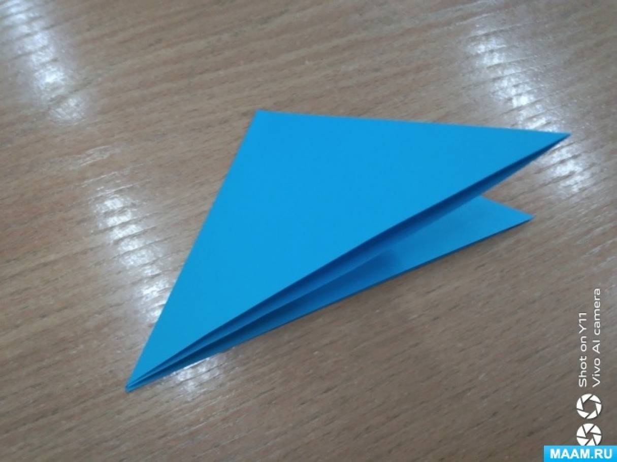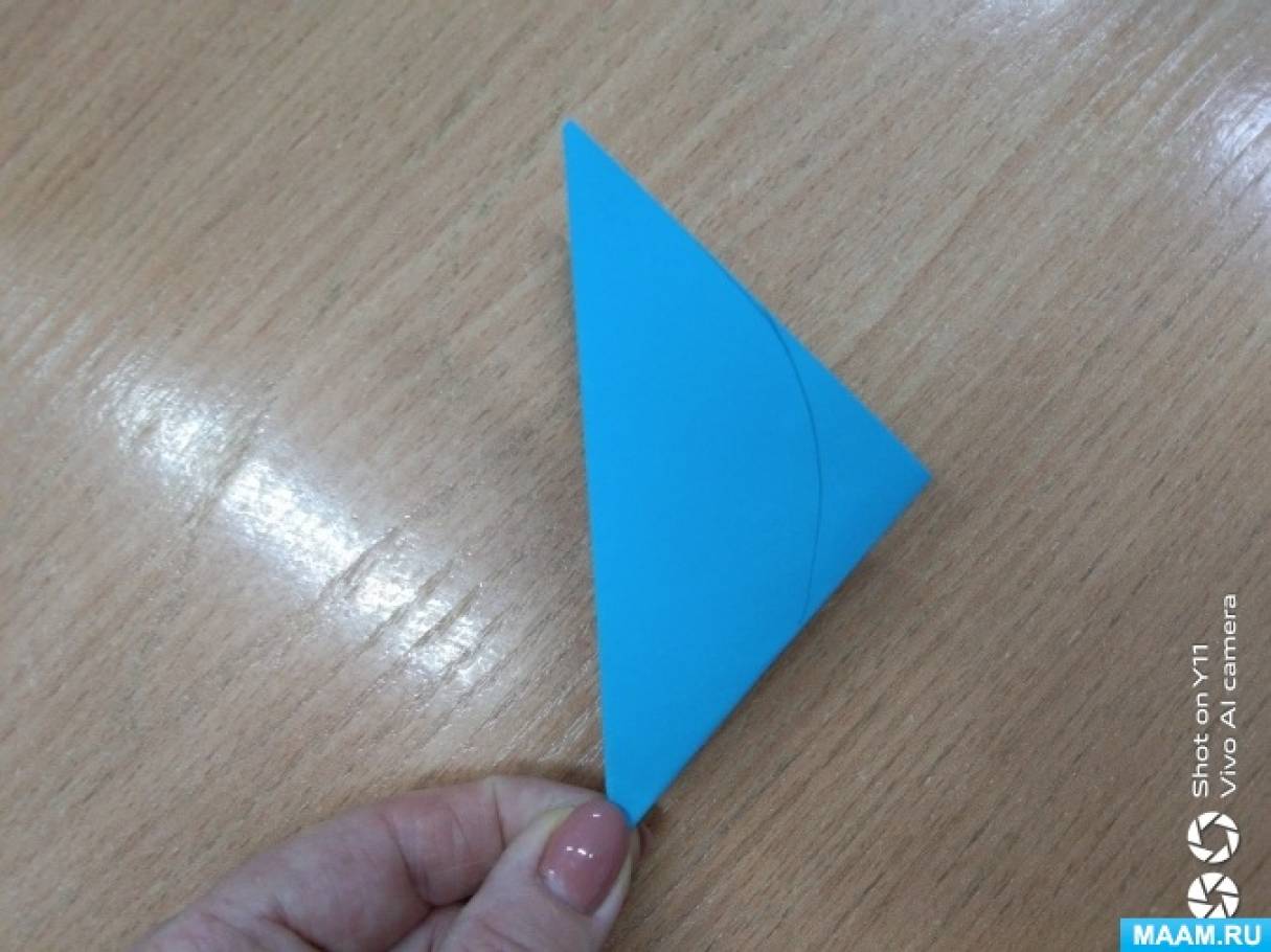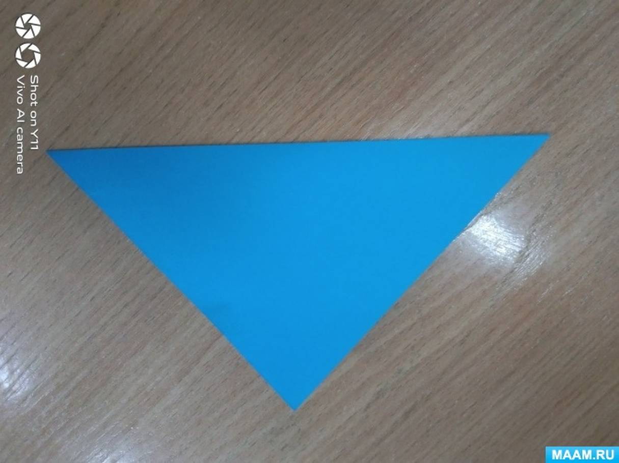 - Взять квадратный лист бумаги и сложить его дважды по диагонали, чтобы получился треугольник.