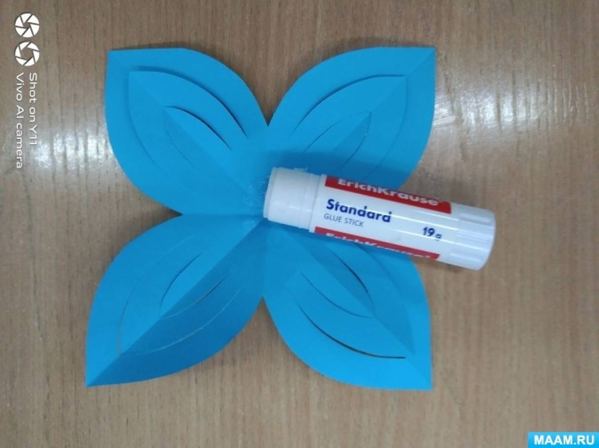 Разворачиваем и намазываем клеем серединку снежинки — звёздочки