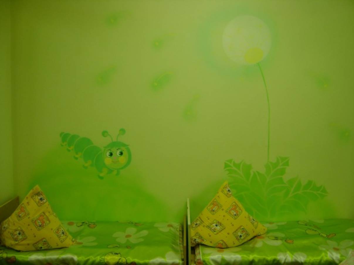 - оптимальный вариант для спальни в детском саду – стены, окрашенные в нежный сиреневый цвет, с небольшими яркими узорами.