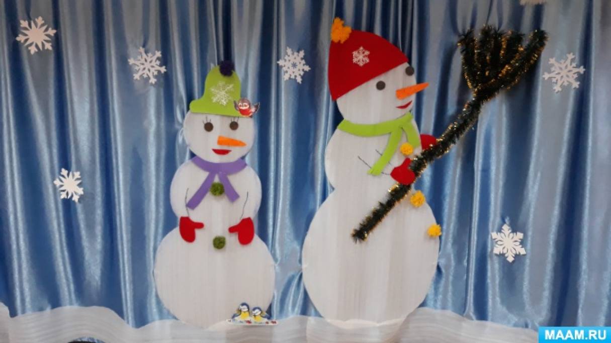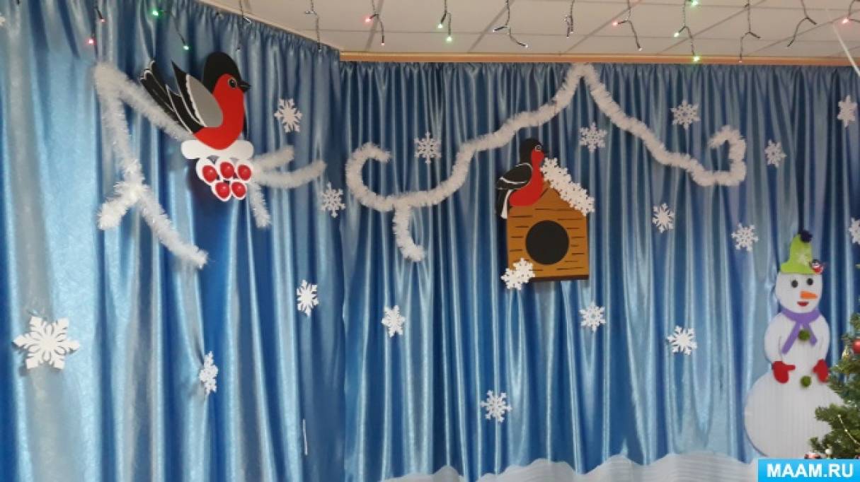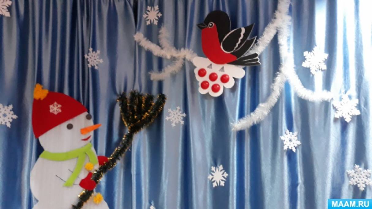 В центре зала решила разместить композицию из снеговиков (они были изготовленны из утеплителя, фетра и цветного картона, которые смахивают птичек с ветки.