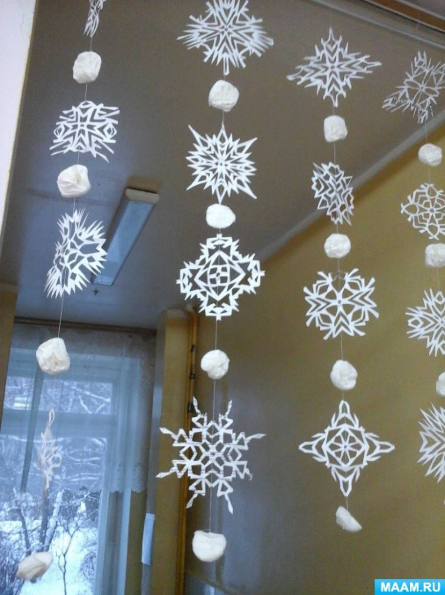 Окна часто украшаю снежинками. Такие поделки вырезают на занятиях дети старшей группы. Для этой цели понадобится бумага или салфетка, ножницы. Приклеить поделки можно в хаотичном порядке либо в виде композиции. Объемными украшениями лучше украсить шторы.