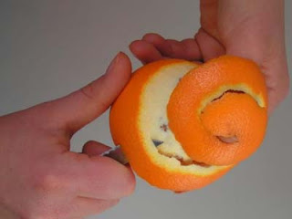 Для их изготовления нам потребуется срезать кожуру с цитруса по спирали, как это сделать можно посмотреть в этой статье Если спираль получилась широкой, её можно разрезать как показано на фото.