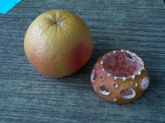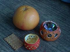 3. Корку выверните и «натяните» на те баночки, которые вы приготовили в качестве формы для шкатулки. При этом одна из половинок апельсина будет шкатулкой, а другая — её крышечкой. Поэкспириментируйте с донышками-крышечками,