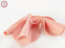 1) Ломтик вареной колбасы сложить пополам, а потом в три сложения «гармошкой».