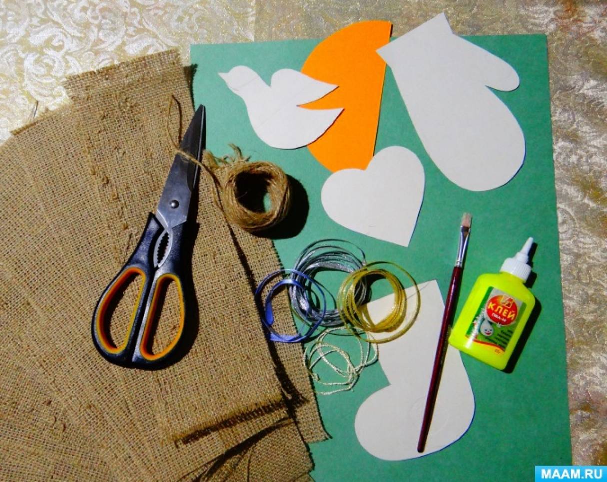 1. Для изготовления новогоднего сувенира нам понадобятся такие материалы: мешковина, шпагат, тесьма, сентипон, стразы, пайетки, картон, ножницы, клей ПВА.