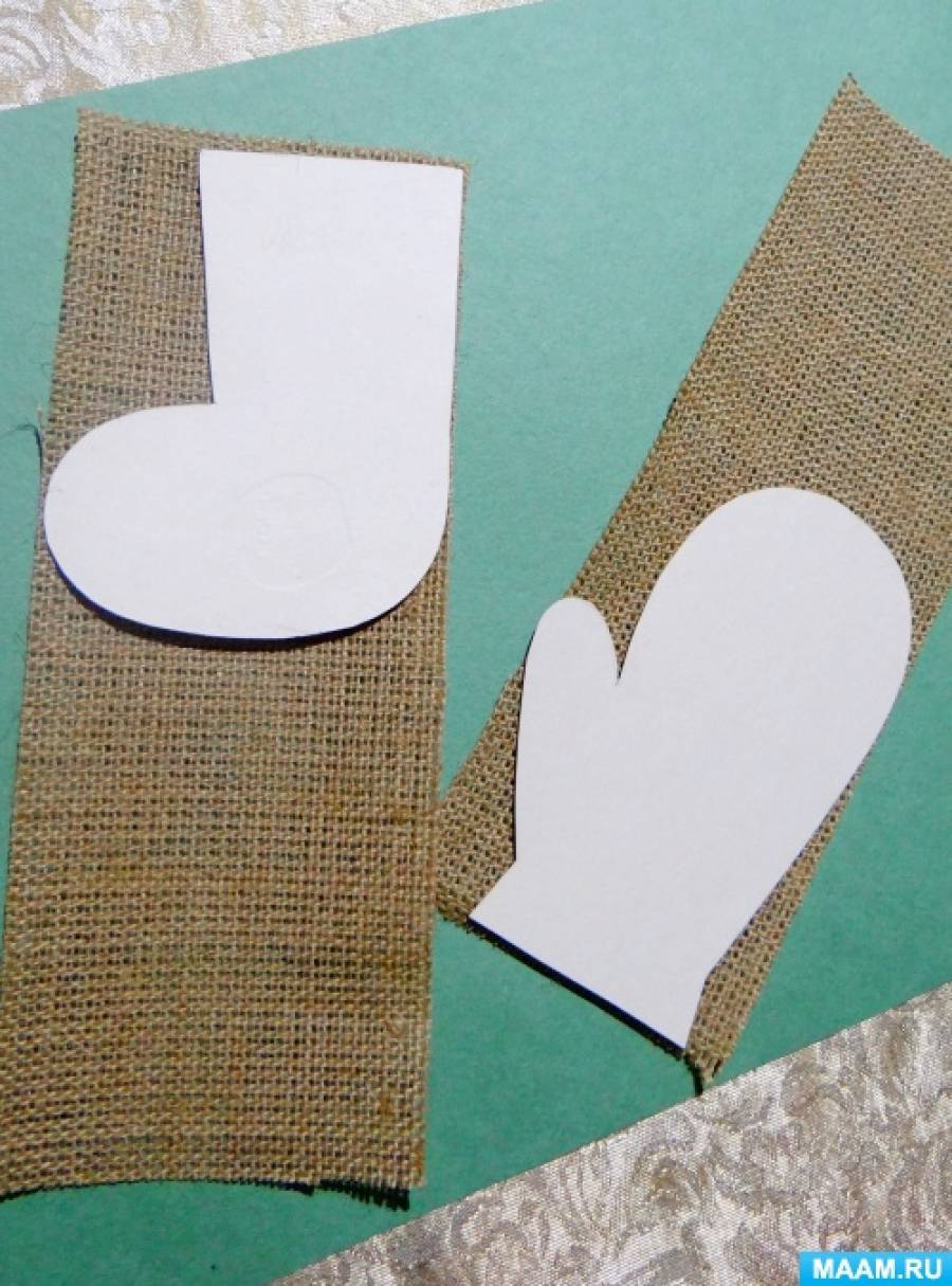 4. Приклеиваем одной стороной наши картонные заготовки к мешковине. Даём время для схватывания их с клеем и вырезаем их по контуру.