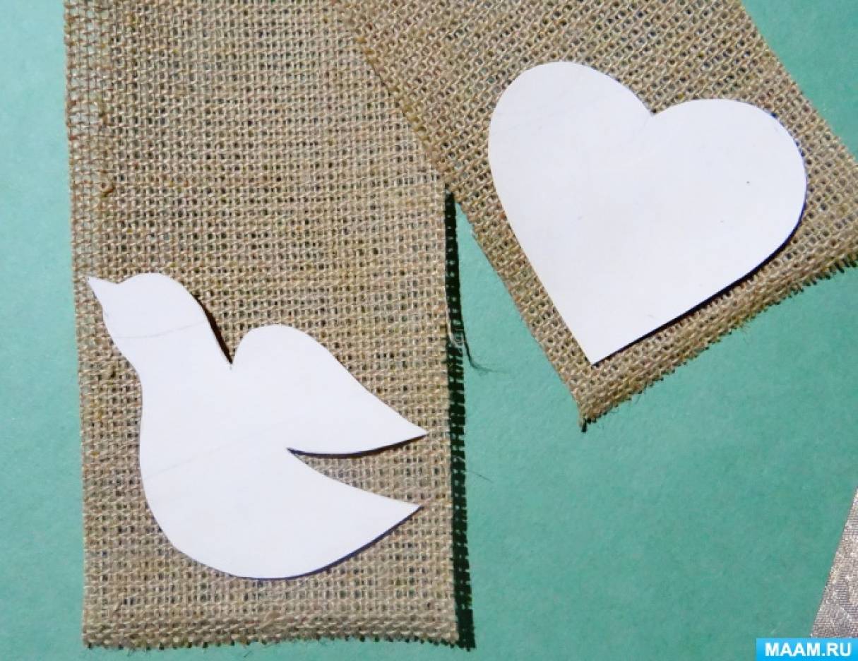 5. То же самое мы проделываем с другой стороны: намазываем клеем, закладываем петельку (24 см) из шпагата или тесьмы, свернув её пополам, и приклеиваем ко второй стороне мешковины. Даём просохнуть изделию пару минут, проглаживая поверхность тёплой ладошкой, и вырезаем по контуру.