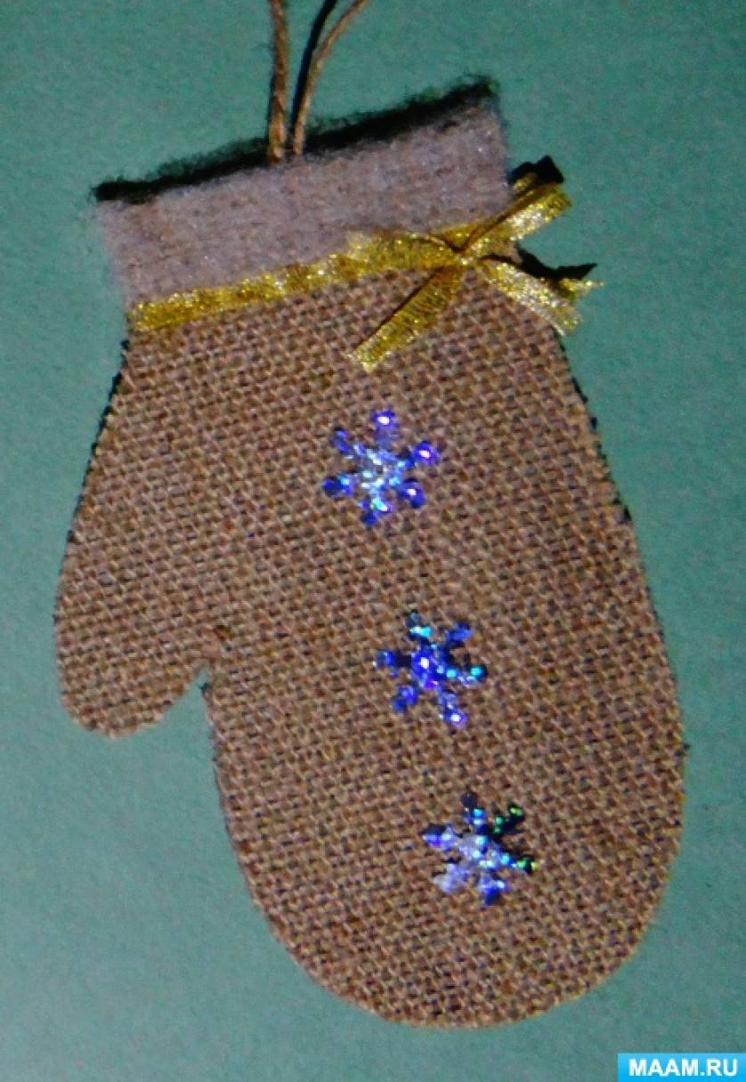 7. Украшаем изделия с обеих сторон: опушку из сентипона можно приклеить на варежку и валенок в верхней части; ниже — тесьму и бантик; пайетки в виде снежинок — по бокам; стразы — в свободных пространствах между ними, имитируя блеск снега.