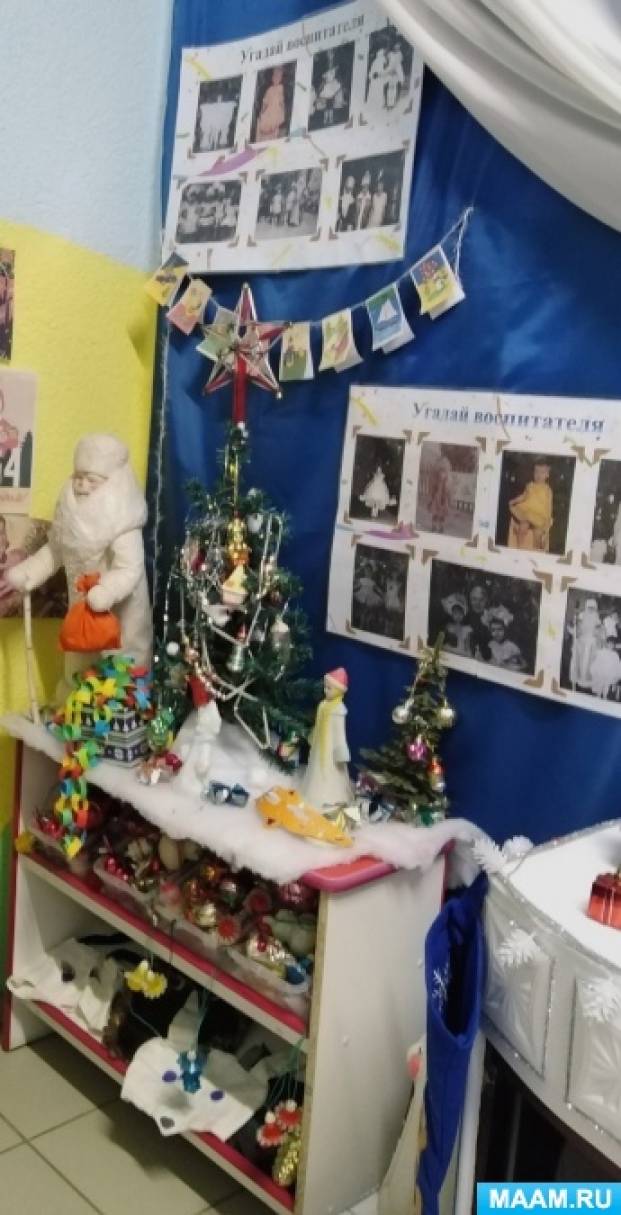 Слева от камина был создан мини-музей, в котором представлены ёлочные игрушки, новогодние открытки, фигуры Деда Мороза и Снегурочки, ёлочка из Советского Союза. Также сделали газету с детскими фотографиями воспитателей в новогодних костюмах — напоминание о том, какими мы были тогда, как наряжались, как радостно встречали любимый праздник.