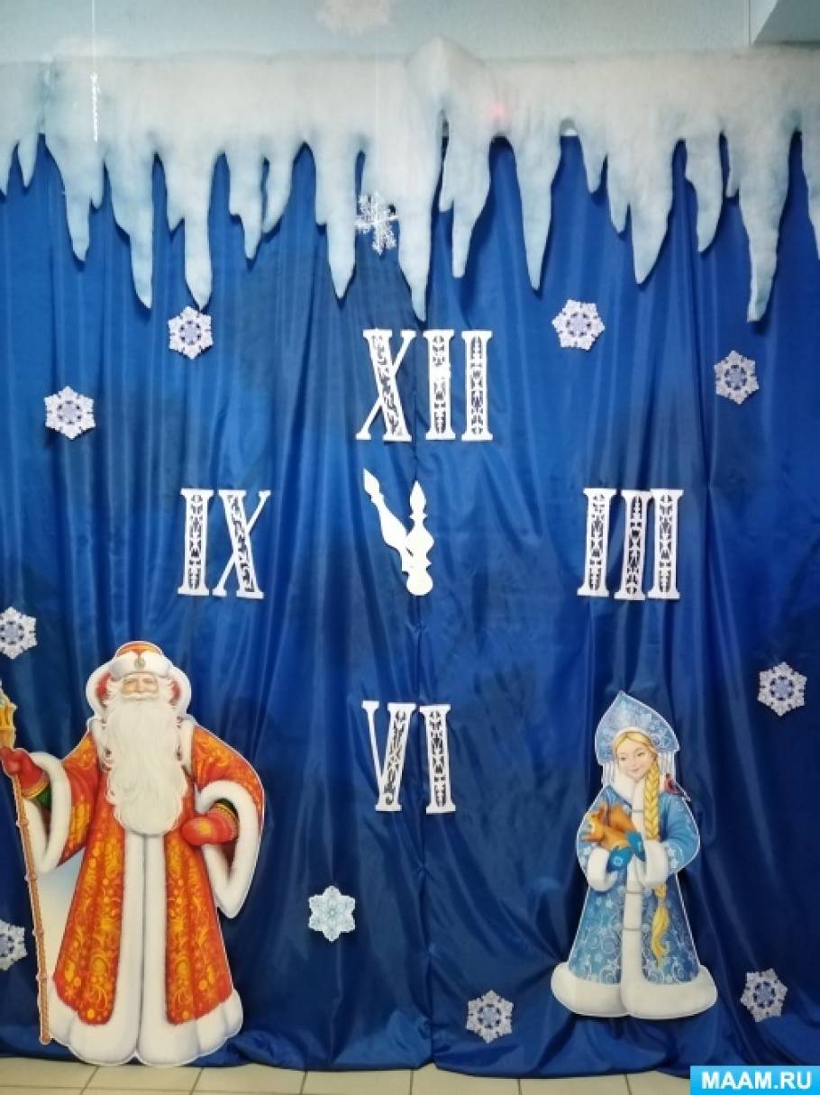 Противоположную ко входу стену украсили своеобразными часами в стиле вытынанки, которые вот-вот пробьют двенадцать, и наступит волшебный Новый год!