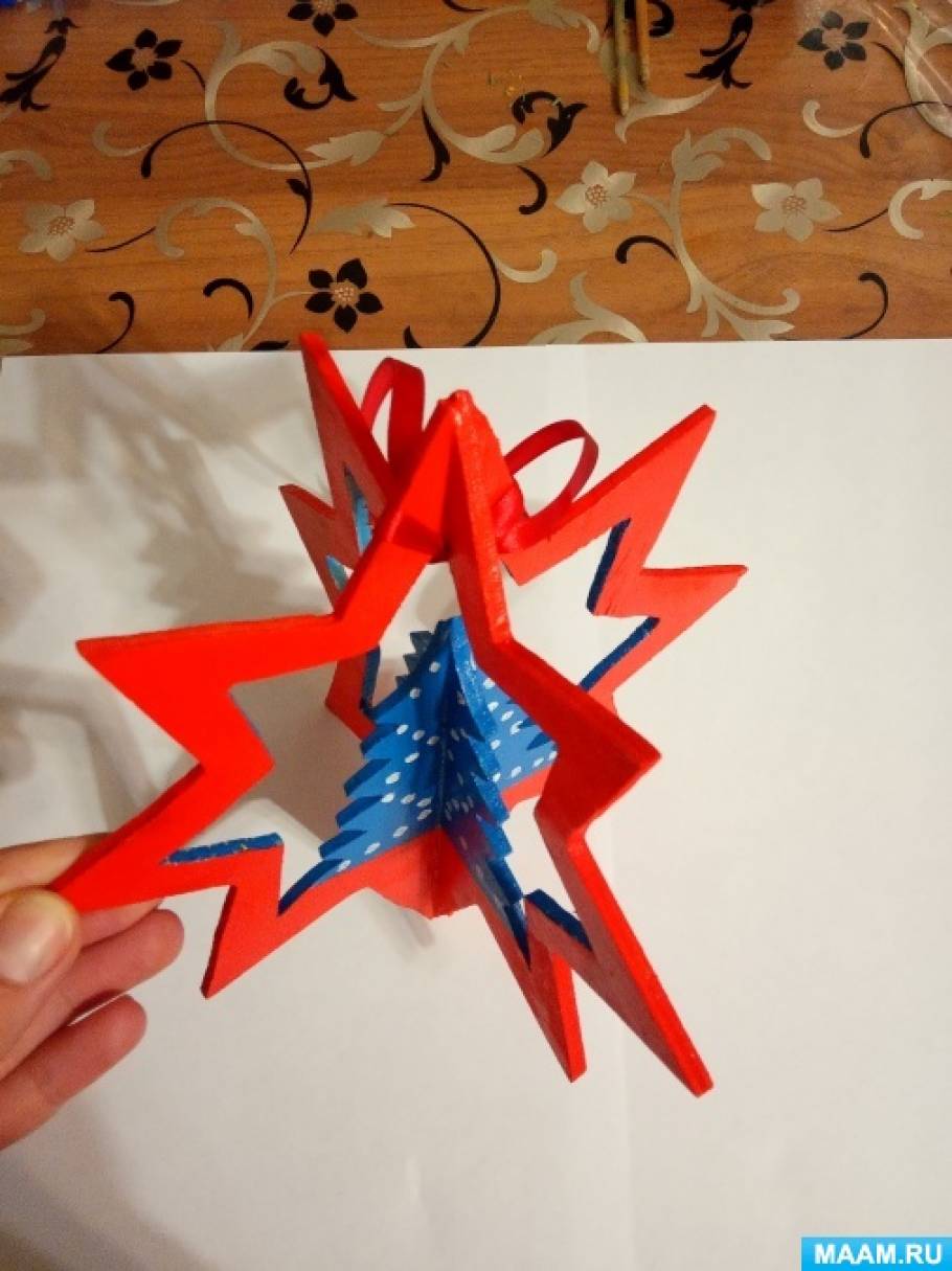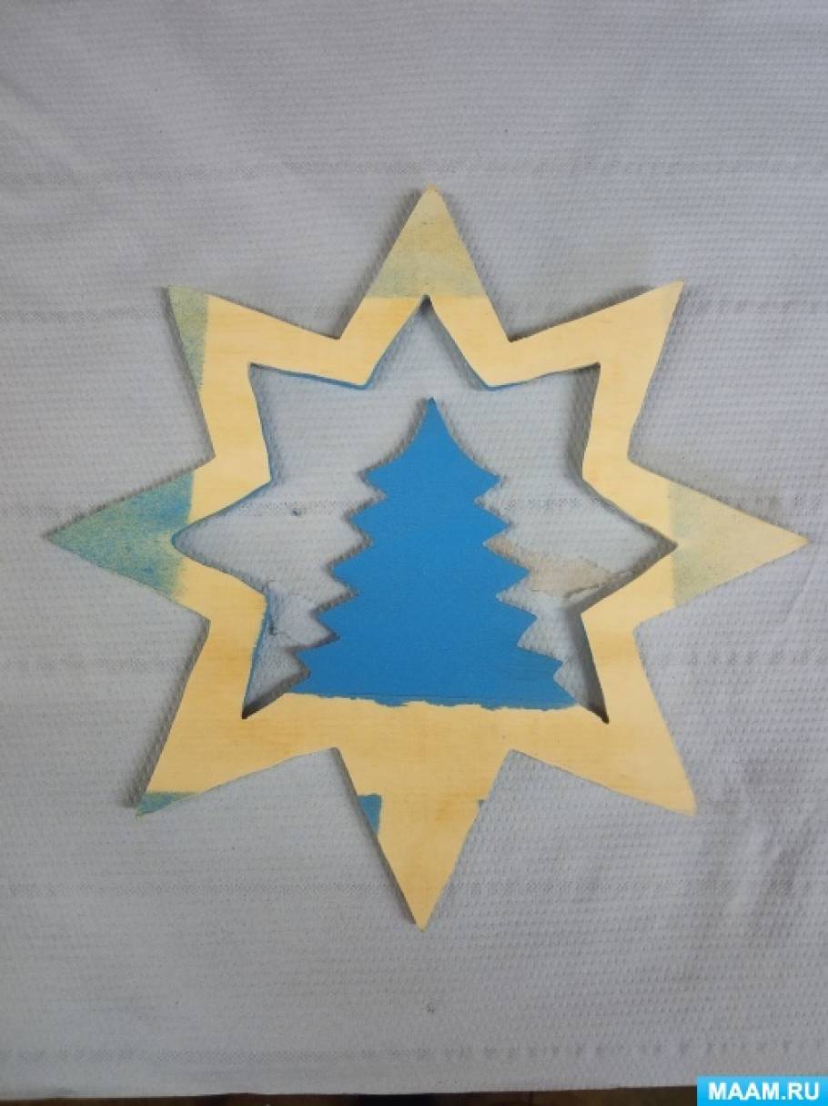Пришла зимняя новогодняя пора и настал вопрос по изготовлению новогодних игрушек для городской ёлки. Я с учениками сразу решила, что из дерева игрушка провесит более 3-5 лет (это точно). И поэтому хочу поделиться с вами, как сделать такую игрушку. Посмотрев картинки в интернете, я выбрала и распечатала картинку звезды, у которой внутри образ елочки. Но плоская игрушка — это очень просто, поэтому я решила сделать её объемной. Для этого мне понадобилось: