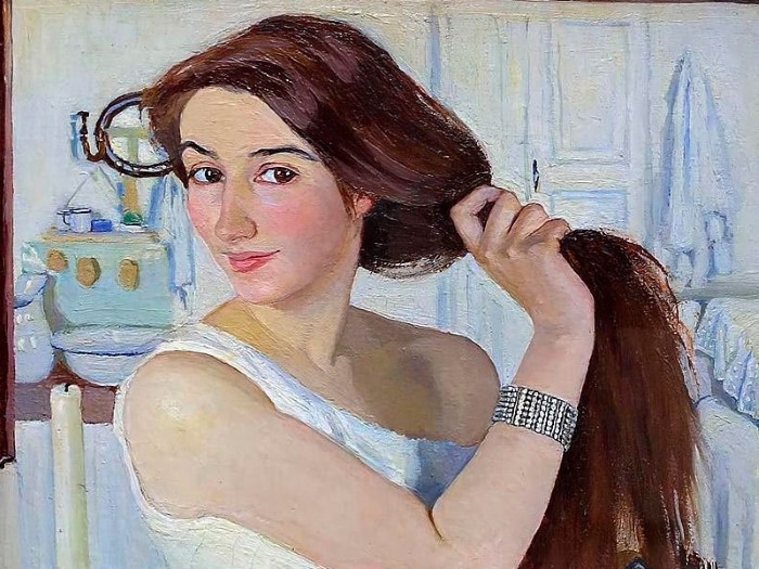 Широкий яркий браслет на полотне “За туалетом. Автопортрет” — подчеркивает значимость украшений для каждой девушки. Утренний момент, когда девушка собирается, приводит себя в порядок, укладывает волосы, делает макияж очень таинственный и личный. На картине изображена девушка, которая олицетворяет невинность и чувственность этого тайного процесса. Она очень рада.