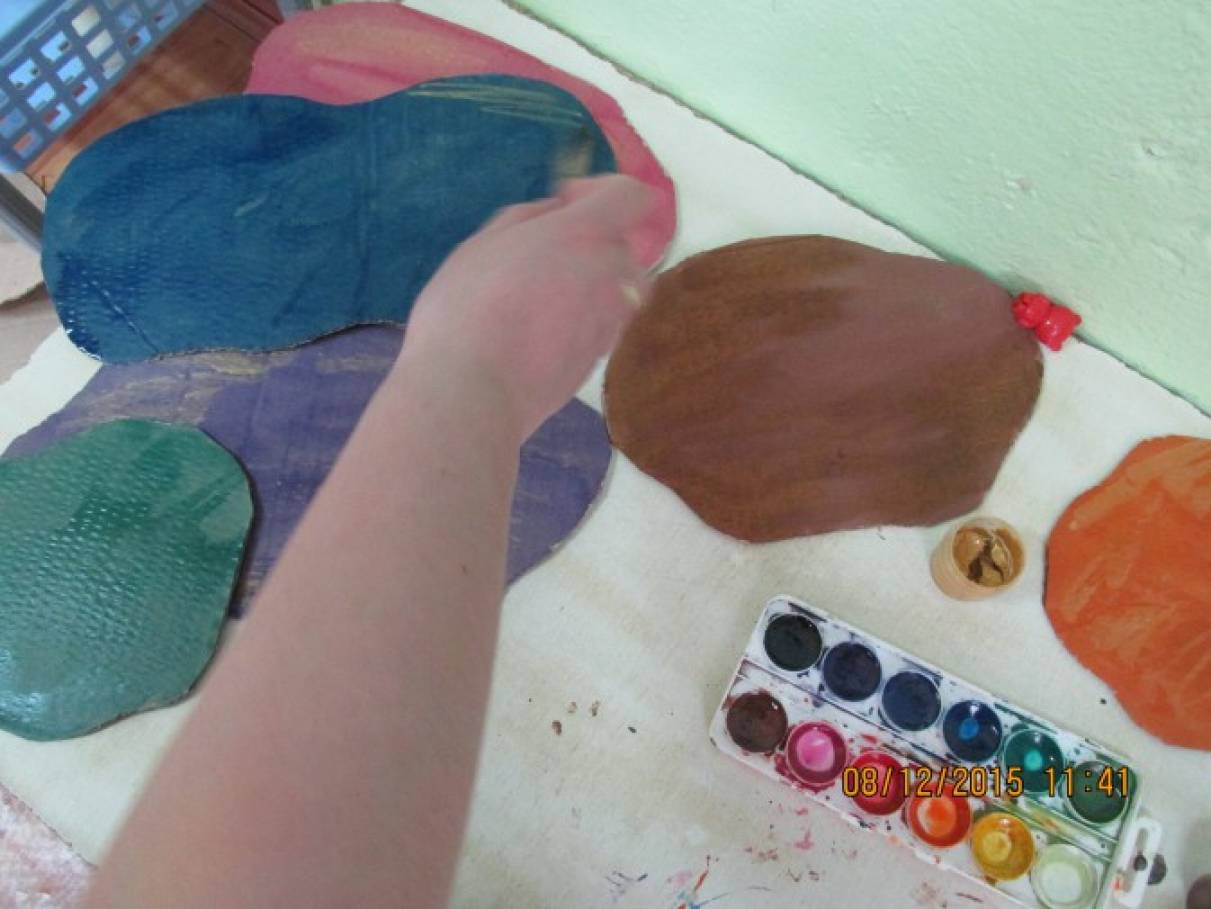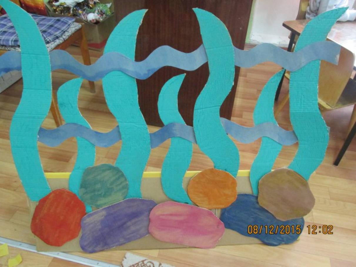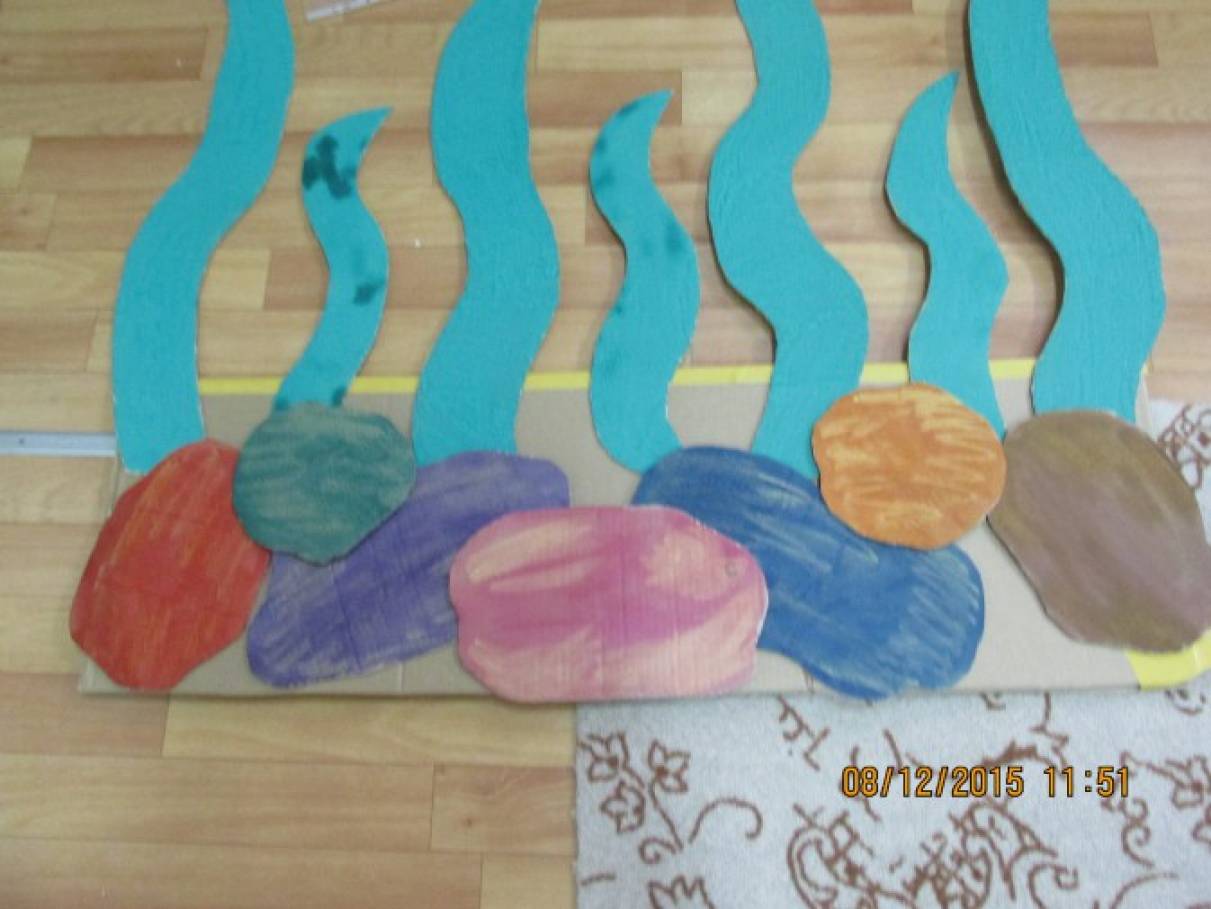 Затем из остатков картона вырезаем подводные камни, раскрашиваем их.