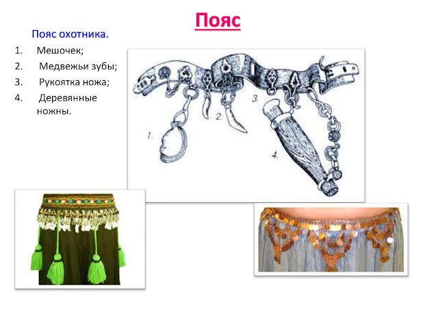 Одним из первых элементов одежды, который стали украшать, стал пояс. Пояс – важная часть костюма. (Слайд 8) У Древних Египтян пояс держал одежду. А в других странах, например: у Древних Греков «подпоясаться» означало вооружиться, собраться в поход. К поясу крепились нож, колчан со стрелами, меч. В эпоху огнестрельного оружия – пистолеты, пороховница, огниво.