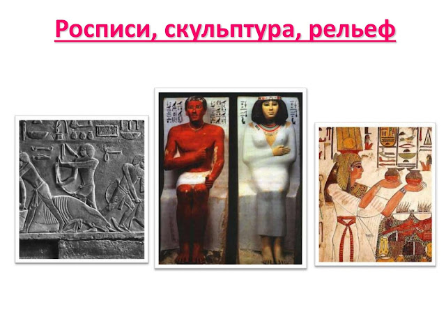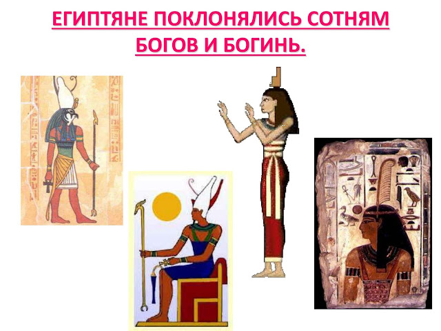 – В этой стране люди поклонялись большому количеству богов, многие из которых были похожи на животных. (Слайд 3) О том, как жили древние египтяне, во что верили, какую носили одежду, мы узнаем, рассматривая и изучая дошедшие до нас рельефы и росписи на стенах пирамид, храмов, саркофагов Древнего Египта. (Слайд 4)