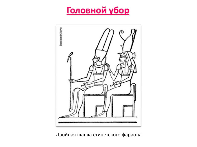 У древних народов головной убор имел больше символическое значение, чем функциональное. Двойная шапка египетского, фараона символизирует его власть над Верхним и Нижним Царствами. (Слайд 9)