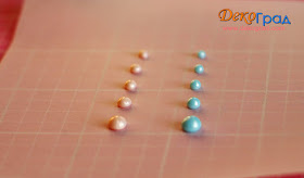 Сначала я нанесла жемчуг на кальку, которую бывает использую в слоях работы. Капельки легли аккуратно и красиво. В бежево-розовый я добавила немного воды. Он некоторое время стоял и немного загустел. Потому вы видите, что капли голубого цвета — не разбавленные, более округлой формы.
