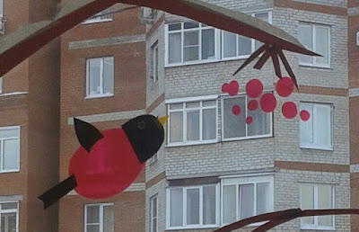 Так мне понравились снегири в блоге Анжелики Фото-дневник. Купила витражную пленку и глазки, теперь они радуют и нас (и правда, красиво пропуская сквозь себя лучи солнца, когда оно бывает). А ветки — из цветной бумаги.