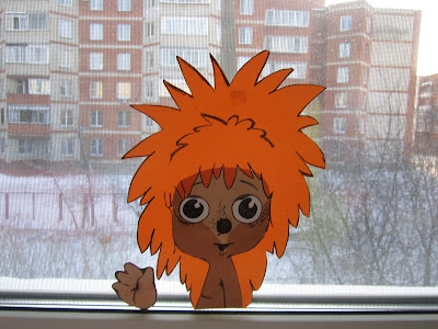 Так мне понравились снегири в блоге Анжелики Фото-дневник. Купила витражную пленку и глазки, теперь они радуют и нас (и правда, красиво пропуская сквозь себя лучи солнца, когда оно бывает). А ветки — из цветной бумаги.