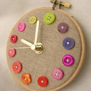 Такие часы можно сделать на пяльцах. Нужно лишь вставить кусок бортовки либо другой ткани и пришиты красивые пуговицы. Дизайн часов можно менять, пришивая разные пуговицы и ткань.