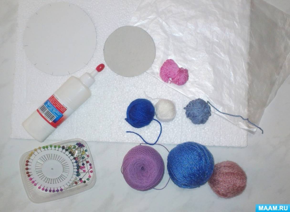 Когда клей хорошо просохнет и нитки станут твёрдыми, убрать булавки и снять целлофан с пенопласта.