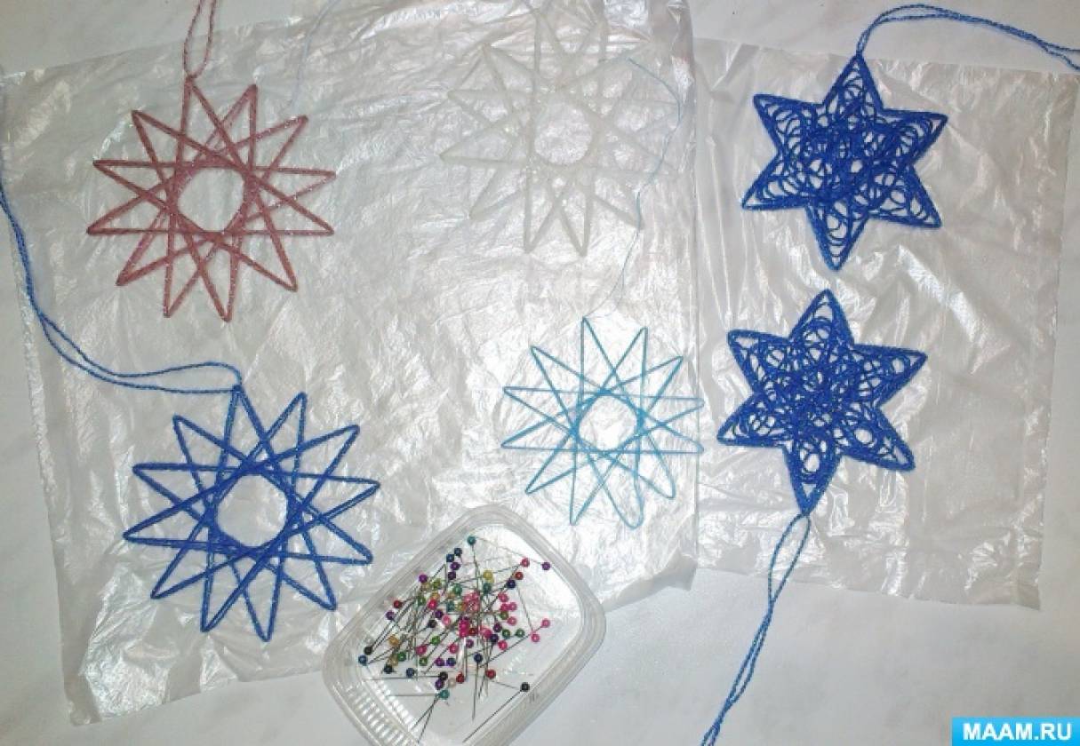 Аналогичным образом можно изготовить и шестиконечную звезду, но внутреннюю её часть заполнить пропитанными в клее ПВА нитками